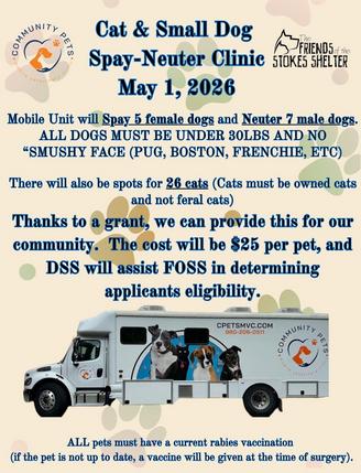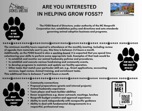 Friends of the Stokes Shelter (FOSS) Animal Adoption Center exists to rescue homeless domestic animals, to facilitate placement in new homes, to serve as a community resource, and to provide information and educational opportunities for pet owners regarding animal health and welfare